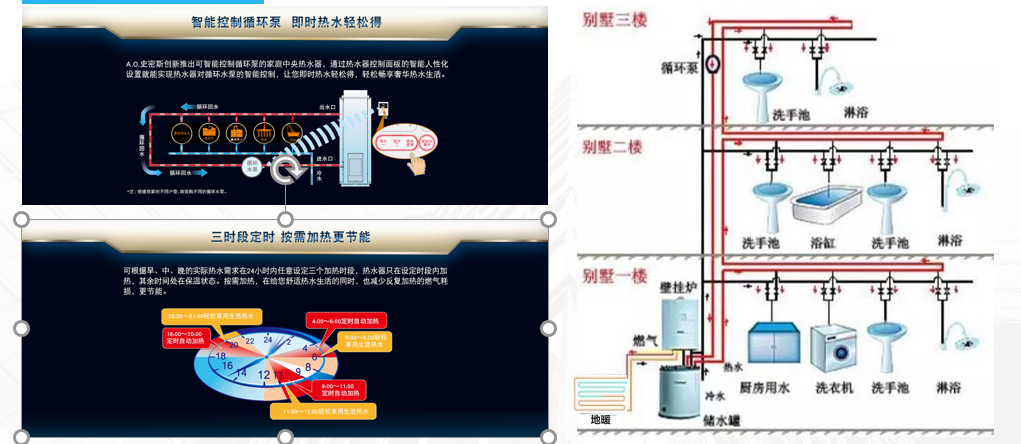 循環系統主要有循環水泵加循環管路,從而保證一打開水龍頭就有熱水出來。